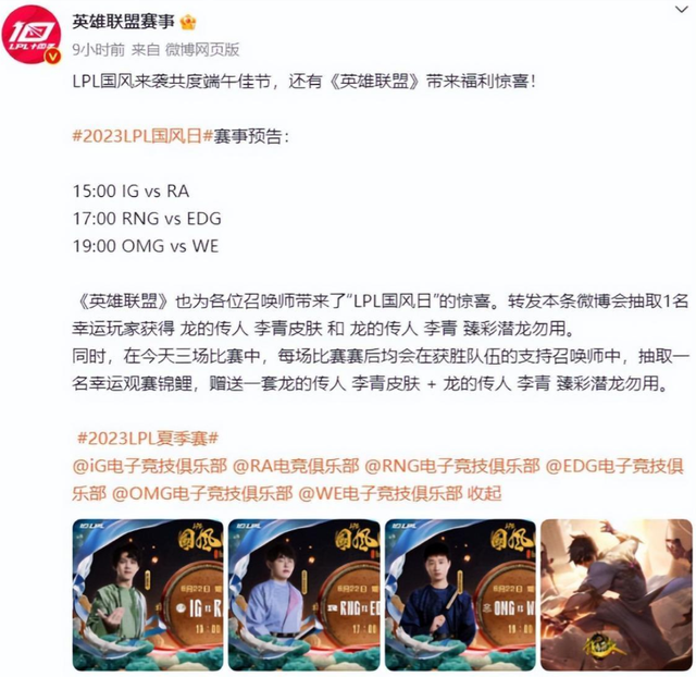 而在近日,端午佳节的到来LPL也顺势举办了一年一度的国风日,以唐代西安作为此次国风日的灵感来源,国风日当天解说、主持也是纷纷穿着唐风华服出现在镜头前,当天LPL赛场充斥着国风元素也进一步传递给观众中华传统文化的魅力。而且LPL官方还在社交媒体上举办活动,在端午节和LPL国风日发布了赛事预告的微博,只要转发该条微博就有机会获得LPL官方送出的“龙的传人 李青”的皮肤以及“龙的传人 李青 臻彩潜龙勿用”。