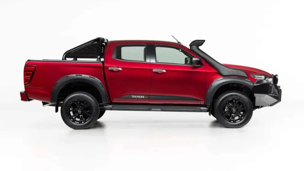 车身侧面,SP Pro版本车身高度有所升高,采用更加宽厚的黑化轮眉设计,相较于普通版本的BT-50整体更加魁梧。同时车辆还配备了熏黑的18英寸越野轮圈,保证激烈越野驾驶时的车辆稳定性。细节方面,车辆门把手、侧脚踏以及新加装的车顶行李架都采用黑化的设计。在侧裙位置增加了SP Pro版本专属标识拉花。Thunder Pro版本车身高度进一步提升,宽厚的前轮眉与坚实的前包围相连接,整体造型相比SP Pro版本更加狂野。