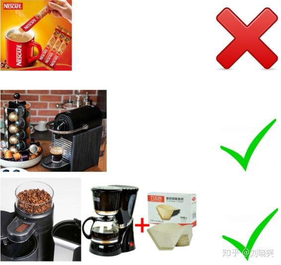 、咖啡粉,没有任何一种咖啡长得像我们在中国喝的雀巢三合一。难道美国人不喝速溶咖啡?后来经过多方考证,唯一在美国能买到速溶咖啡的地方就是亚洲超市,美国人不喝速溶咖啡!那美国人怎么喝咖啡呢?最简单的办法,对他们来说是速溶咖啡的,就是像下图第二排的那些圆形小盒子,胶囊咖啡,用专门的胶囊咖啡机,可以打咖啡出来,这种往往在公司里面用, 比较方便。而美国人的家里,往往是两套设备,如下图第三排,先用磨咖啡豆机把咖啡豆磨碎,然后用煮咖啡机器,把磨碎的咖啡豆铺在滤纸上,用煮咖啡机把咖啡煮出来。