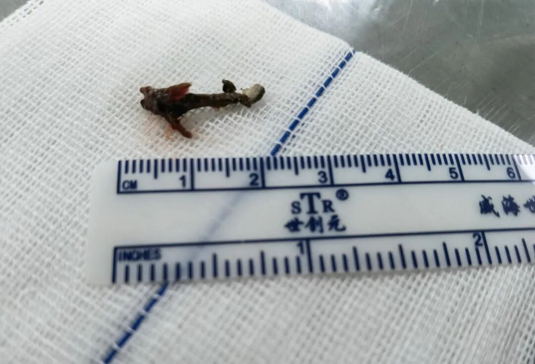 此异物长达2CM左右,呈黑褐色,疑似鸭骨。