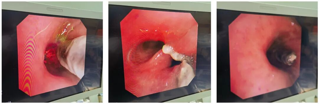 张雷医师尝试钳除,但异物下端固定得很深,稍有触碰就出血明显。考虑到盲目拔除容易引起大出血危及生命,呼吸介入团队随即进行了讨论,后决定,改为全麻下在手术室进行异物取出。