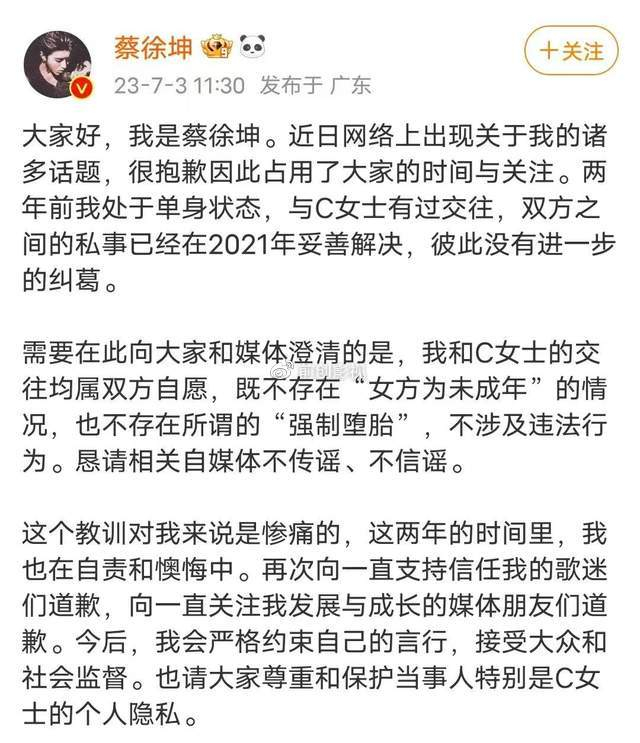 北京时间7月3日,等待了许久之后,蔡徐坤方面的回应终于来了,蔡徐坤本人在社交媒体上发文,公开回应了此前关于C女士的各种传闻。