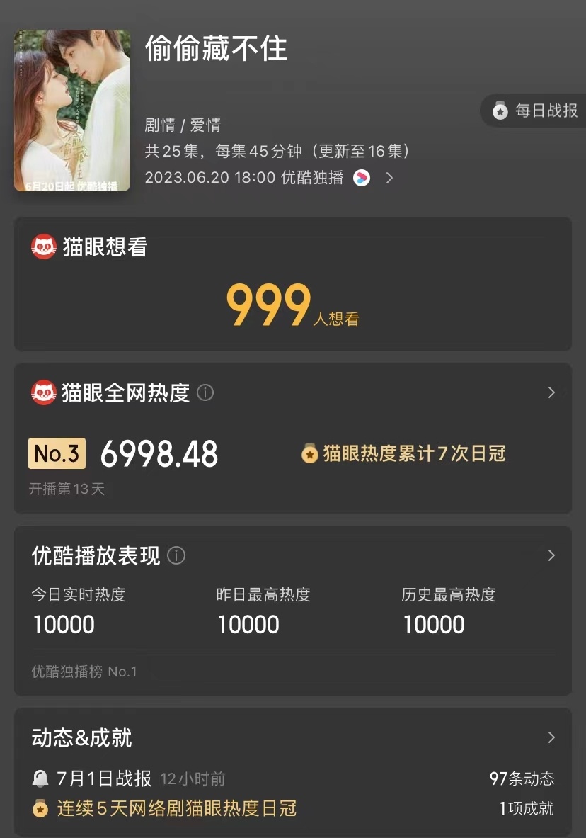 上线一个月以来,热度一直在前三,优酷热度更是破万,原著小说名气大,喜欢青春偶像剧的朋友一定有所关注。