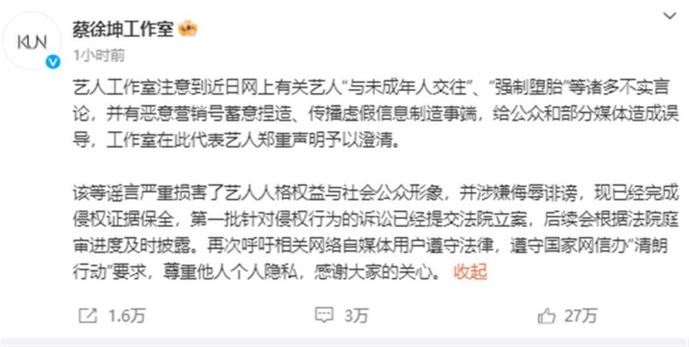 随后,蔡徐坤工作室也发声明回应称,对于网上有关艺人“与未成年人交往”“强制堕胎”等诸多不实言论,代表艺人郑重声明予以澄清,并表示,对于涉嫌侮辱诽谤的谣言,已提交法院立案。