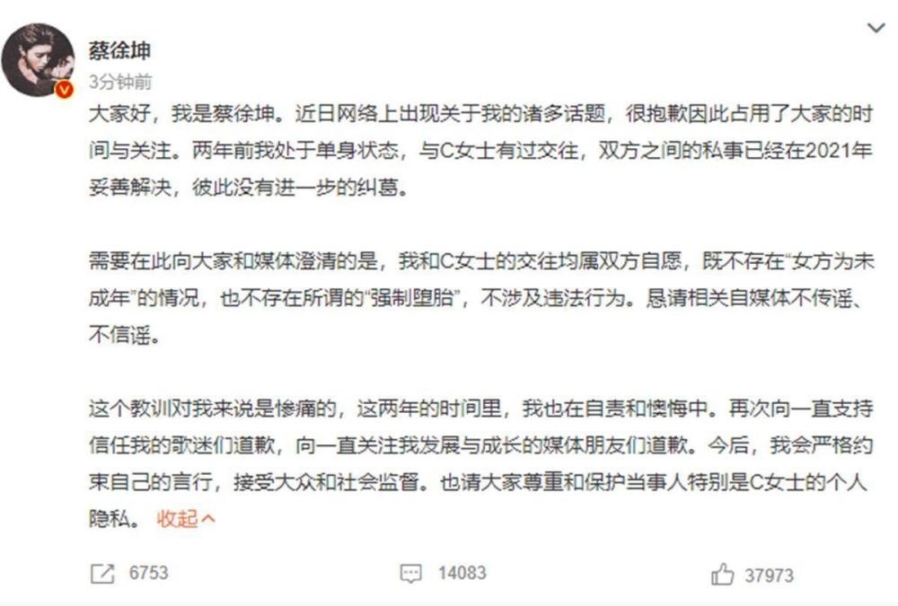 近日,顶流艺人蔡徐坤被曝和一位C姓女生发生关系并致其怀孕,随后蔡徐坤让她堕胎,事件持续发酵引发热议。7月3日,蔡徐坤发文回应称,他与C女士两年前曾交往,当时他处于单身状态,双方之间的私事已妥善解决。同时表示和C女士的交往属双方自愿,不存在“女方为未成年”“强制堕胎”等情节,不涉及违法行为。