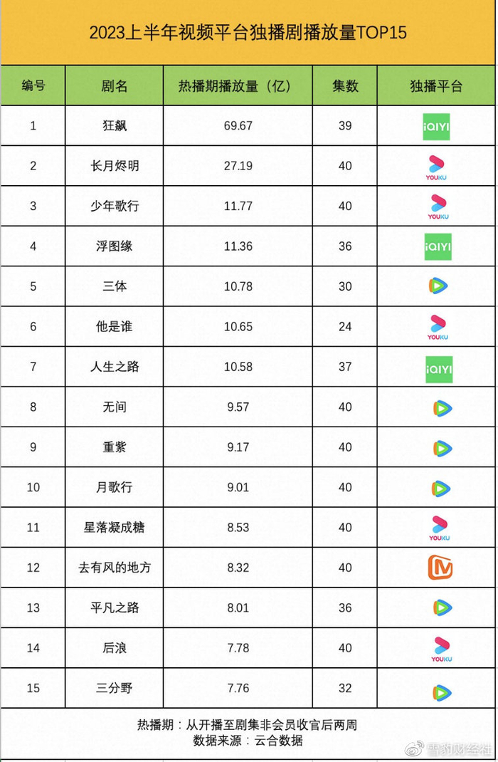 根据云合数据,今年上半年,视频平台独播剧播放量Top15中,优酷占5,腾讯6,爱奇艺3,芒果1。播放量Top3中,优酷占两席领跑。