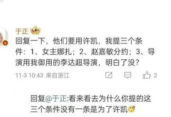 但是,丝芭又看中了许凯,想要其担任男主。在与于正的一番商谈后,许凯出演《雪鹰领主》有了三个前提。