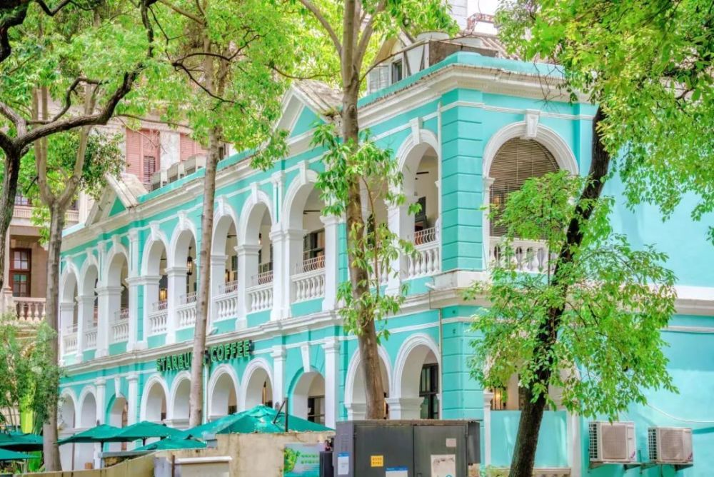 沙面大街1号,树荫下米色外墙的洋楼别墅,19世纪末法国警署旧址,猫屎咖啡就在这充满法式浪漫的百年建筑中。