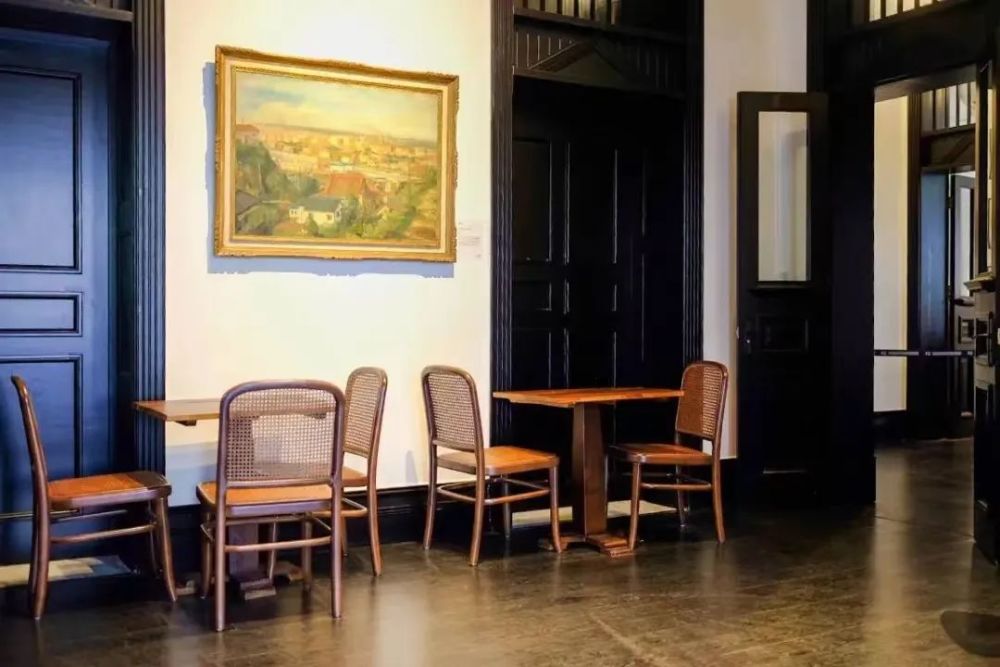 在转角阳台上,喝杯咖啡、吃个下午茶,还能在百年前建筑氛围的簇拥下,欣赏众多名家书画真迹,别有一番风情。
