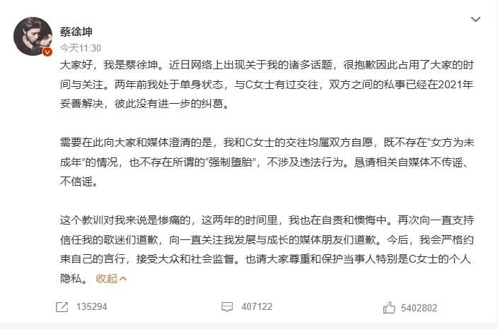蔡徐坤承认自己曾经造成女方有过怀孕和打胎的经历。但是,与此同时,蔡徐坤强调了,他和C女士的交往,并不存在“女方为未成年人”的情况,也不存在所谓的“强制堕胎”。蔡徐坤强调,这些都是女方的自愿行为,不涉及违法行为。蔡徐坤的工作室也澄清“与未成年人交往”、“强制堕胎”等诸多不实言论。但是,蔡徐坤仍然表示,自己对此深感自责,希望能够得到大家的谅解。同时,蔡徐坤也已经对造谣者提起了诉讼。此消息一出,立刻引爆了热搜。