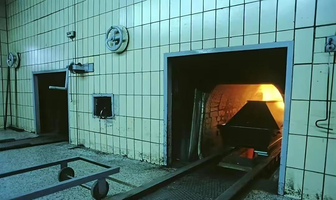 随后,殡仪馆工作人员将尸体推进火花间准备火化。