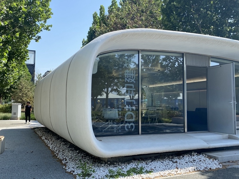 在未来设计园区的广场上,有一座浅灰色、弧形边缘的混凝土材质“大房子”。玻璃门上,“3D打印建筑”几个字勾起了记者的好奇心。