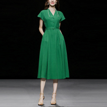 裙子的小V领,包扣,腰带都设计的很精致,墨绿也还有视觉收缩的效果,看起来很显瘦。裙摆A字型,对梨形身材非常友好。