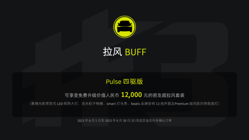 Pro+也同样无法购买我个人认为超值的密友超拉风套装(含赛博光影贯穿式 LED 矩阵大灯、自适应远近光、smart 灯光秀、Beats 品牌音响、640W 13 扬声器、Fresh Air Teach和64 色氛围灯)。而且目前这个价值12000的套装在Pulse四驱版上还是赠送的,除此之外还有3000元的尾款抵扣。这些权益也显得25.59万的Premium版性价比没有那么突出了,动力比Pulse四驱版弱了不说,多出的配置在密友超拉风套装里面也基本都有。