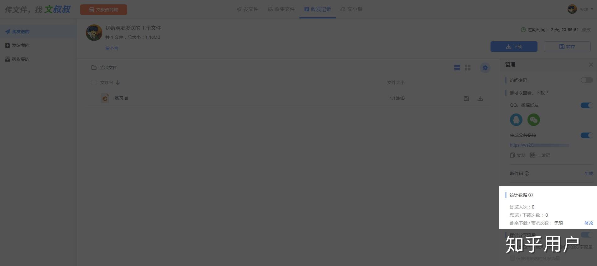 可以在发文件的管理页面“收发记录---我发送的”查看下载次数记录,