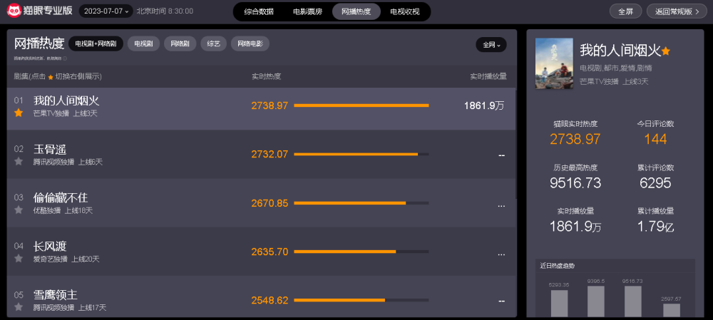 截至发文时间(7月7日上午8时30分),从“猫眼专业版”实时数据显示可知,当前热播电视剧中,网播热度榜前五分别如下:
