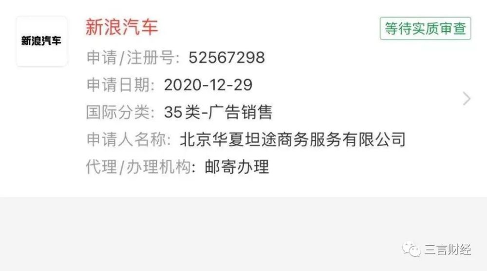 去年12月底,北京华夏坦途商务服务有限公司申请注册了“新浪汽车”商标,目前商标状态为“等待实质审查”。该商标国际分类为35类含广告销售。
