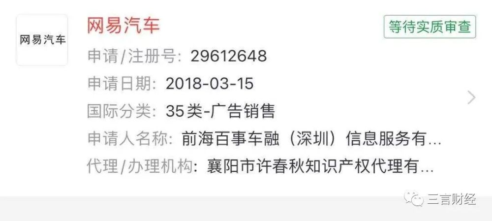 另外,前海百事车融还曾于2018年3月15日申请注册过“网易汽车”商标,目前申请状态为“等待实质审查”。该商标国际分类35类含广告销售。