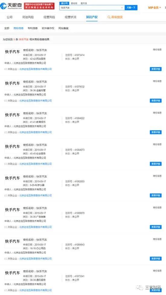 快手关联公司北京达佳互联信息技术有限公司曾于2019年9月申请注册多个“快手汽车”商标。国际分类设计网站服务、科学仪器、教育娱乐等,目前商标状态多为已注册。