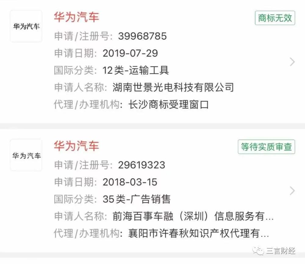例如湖南世景光电科技有限公司和前海百事车融(深圳)信息服务有限公司就分别于2019年和2018年申请注册过“华为汽车”商标。其中,湖南世景光电申请的商标状态显示“商标无效”,国际分类为12类含运输工具;而前海百事车融申请的商标状态显示为“等待实质审查”,国际分类为35类含广告销售。
