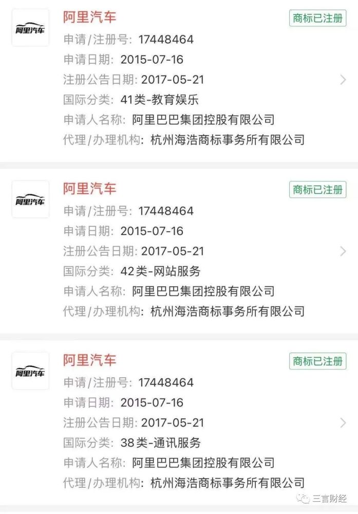阿里巴巴也申请注册成功“阿里汽车”商标。2015年,阿里巴巴申请注册多个分类的“阿里汽车”商标,并且目前商标状态均为“商标已注册”。“阿里汽车”商标的国际分类包含38类通讯服务、42类网站服务以及41类教育娱乐。