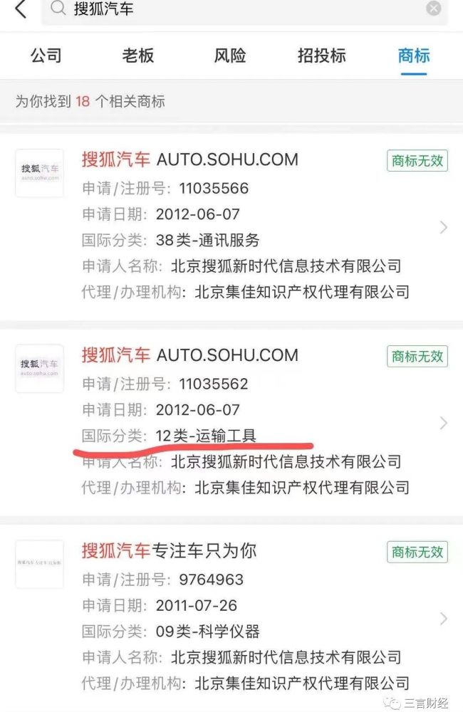 搜狐曾于2011年和2012年申请注册过“搜狐汽车”商标,不过商标申请状态均显示为“商标无效”。