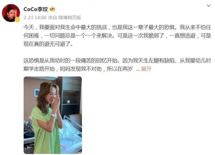 今年2月,李玟发布微博给自己的手术打气,称这是自己生命中最大的挑战和恐惧。照片中,李玟双手合十,祈祷顺利。