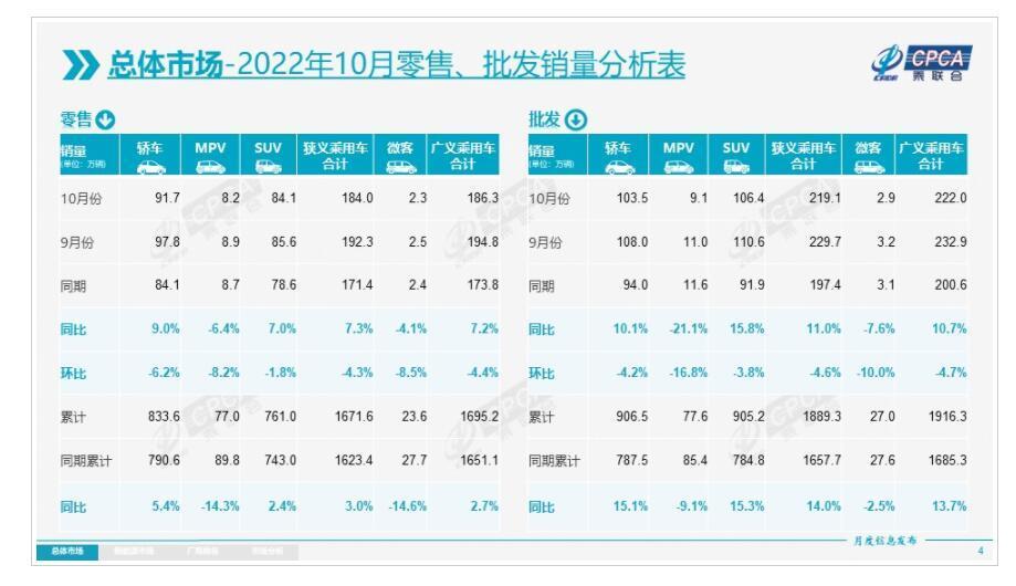 这,也是2013年以来首次出现“金九银十”的环比下降特质。乘联会数据显示,2022年10月份乘用车市场零售销量达到184.0万辆,同比增长7.3%,环比下降4.3%;2022年1-10月份,国内乘用车零售销量为1617.6万台,同比上涨3%。