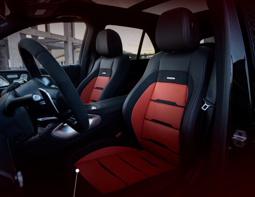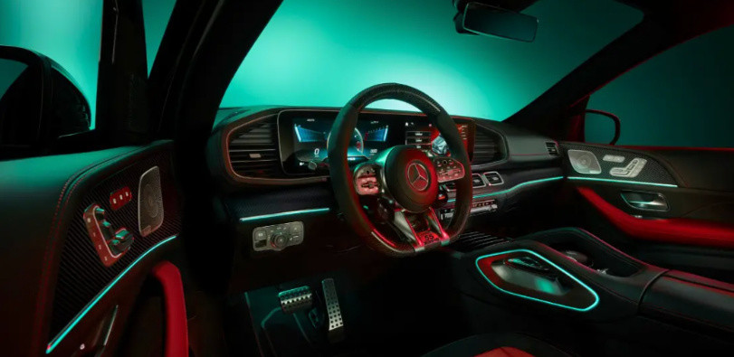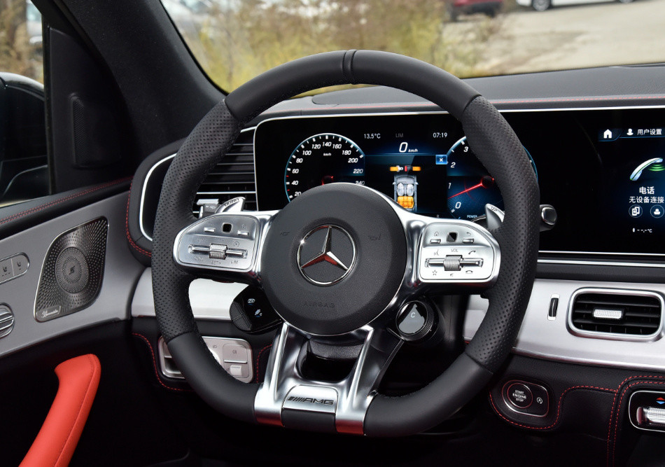 AMG GLE 53 4MATIC+ 55周年纪念版的内饰设计也未发生明显变化,不过车内配色改为红黑撞色设计,进一步凸显自身的运动感。主驾驶正前方配备三幅平底式多功能方向盘底部设置55 AMG的专属标识,12:00方向的回正标识采用黑色装饰,同时迎宾踏板以及地板上拥有专属标识点缀。可惜该款车型的整套内饰比较低调,坐进车内可能会让人忘记它是一台血统纯正的AMG。