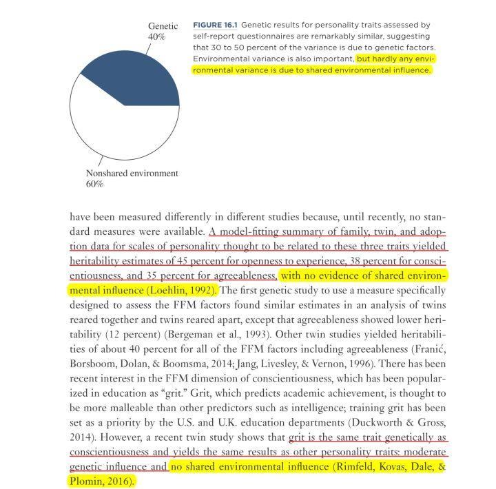 详细数据得取决于你是在问 personality, temperament, character。问 personality 典型数据是这样,但数据中所指的基因(遗传)、环境都与口语上所指涵义不同。