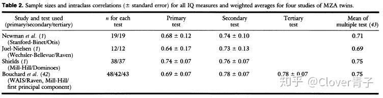 下表比较了全部四项研究的样本量和类内相关性。这些相关性在一个狭窄的范围内(0.64至0.74)变化,这表明在没有环境相似性的假设下,遗传因素约占智商差异的70%。智商的广泛遗传力的这一估计高于最新的估计值(0.47至0.58)的基础上。