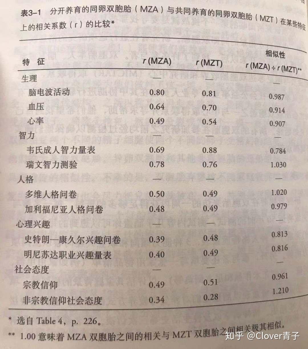 第一列数据显示分开养育的同卵双胞胎,第二列数据显示共同养育的同卵双胞胎,第三列是他们的比值。
