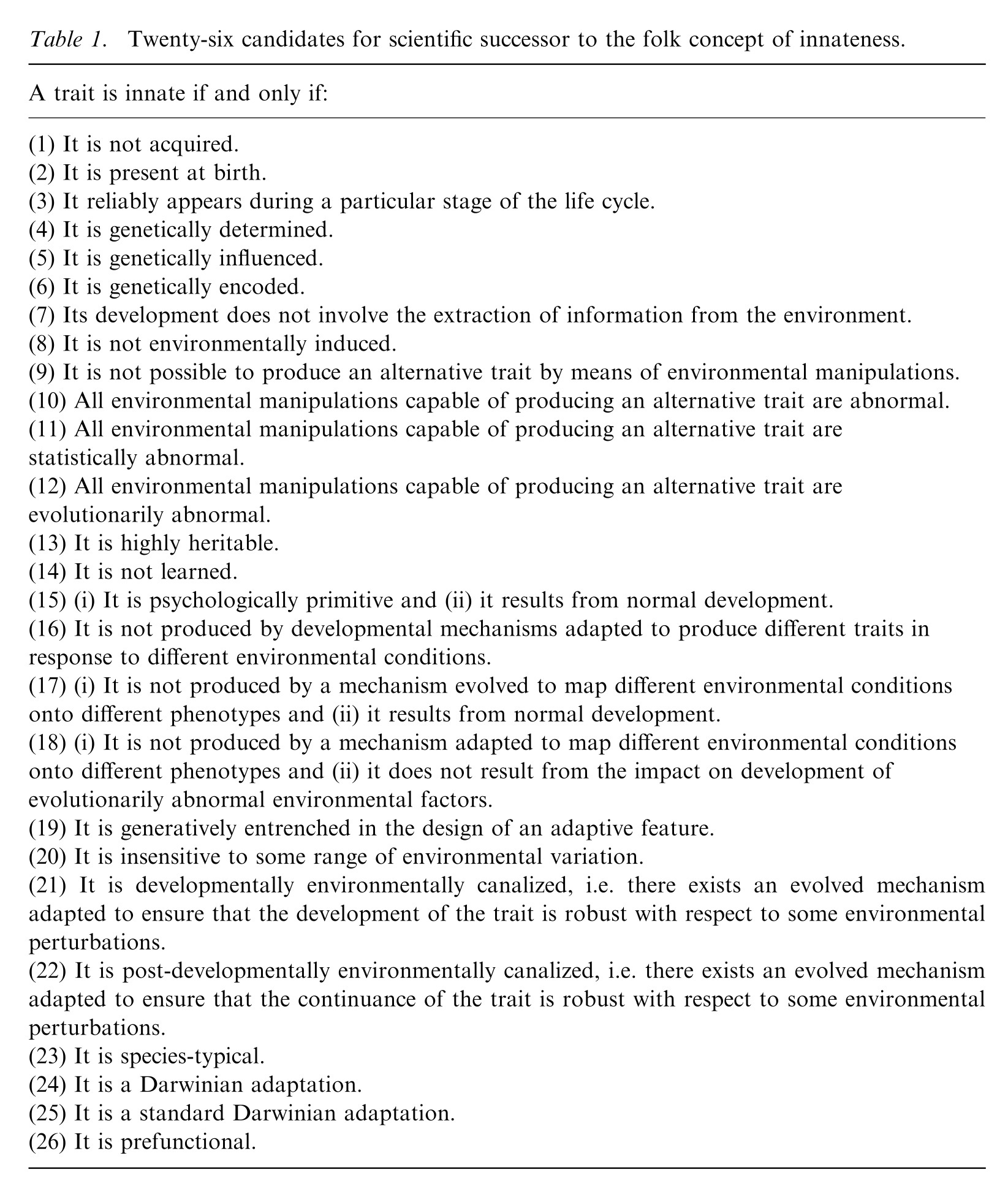 Daniel L. Everett 曾列举19种 innate(先天)的可能定义,用来说明这些定义不够充分完整,innate 是需要淘汰的概念。在知乎有些问题涉及到先天,后天,基因,环境,天赋,努力这种奇怪对立的二分法,定义没有清楚,有些人甚至错认将 “先天”这个概念理解为底下第13种定义,可能间接倾向有遗传决定论的认同。a trait is innate if it is not acquireda trait is innate if it is present at birtha trait is innate if it reliably appears during a particular, well-defined stage of lifea trait is innate if it is genetically determineda trait is innate if it is genetically influenceda trait is innate if it is genetically encodeda trait is innate if its development doesn't involve the extraction of information from the environmenta trait is innate if it is not environmentally induceda trait is innate if it is not possible to produce an alternative trait by means of environmental manipulationsa trait is innate if all environmental manipulations capable of producing an alternative trait are abnormala trait is innate if all environmental manipulations capable of producing an alternative trait are statistically abnormala trait is innate if all environmental manipulations capable of producing an alternative trait are evolutionarily abnormala trait is innate if it is highly heritablea trait is innate if it is not learneda trait is innate if (i) the trait is psychologically primitive and (ii) the trait results from normal developmenta trait is innate if it is generatively entrenched in the design of an adaptive featurea trait is innate if it is environmentally canalized, in the sense that it is insensitive to some range of environmental variationa trait is innate if it is species-typicala trait is innate if it is pre-functional