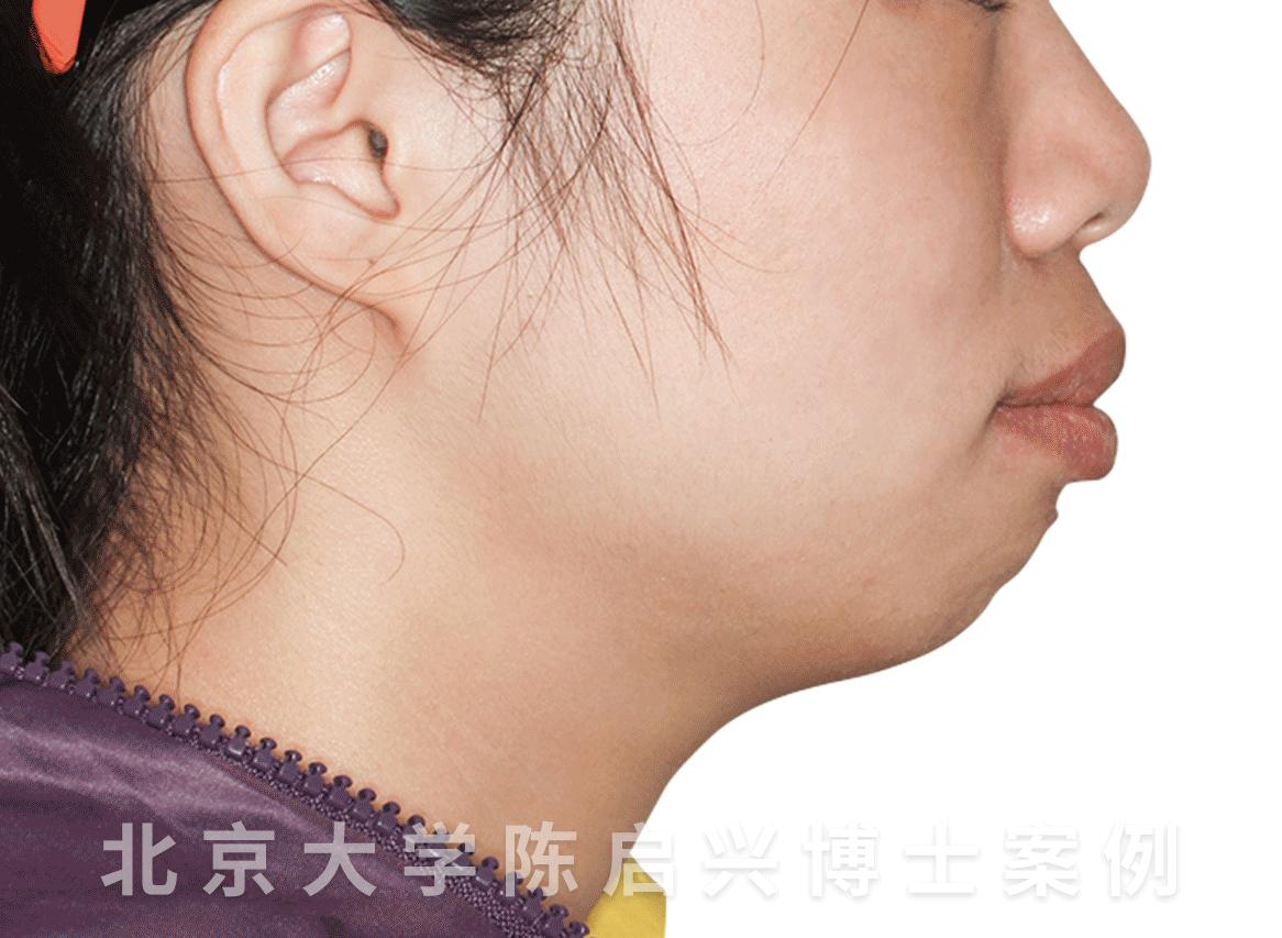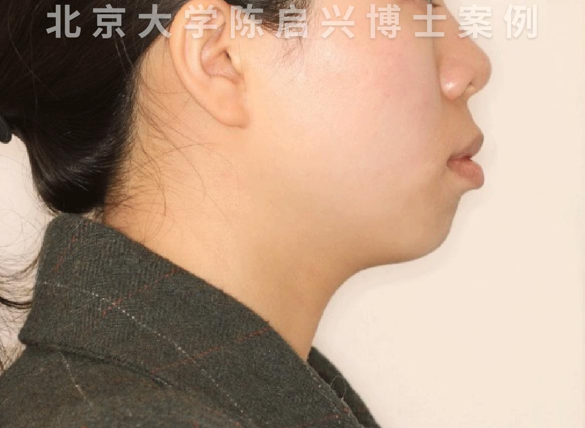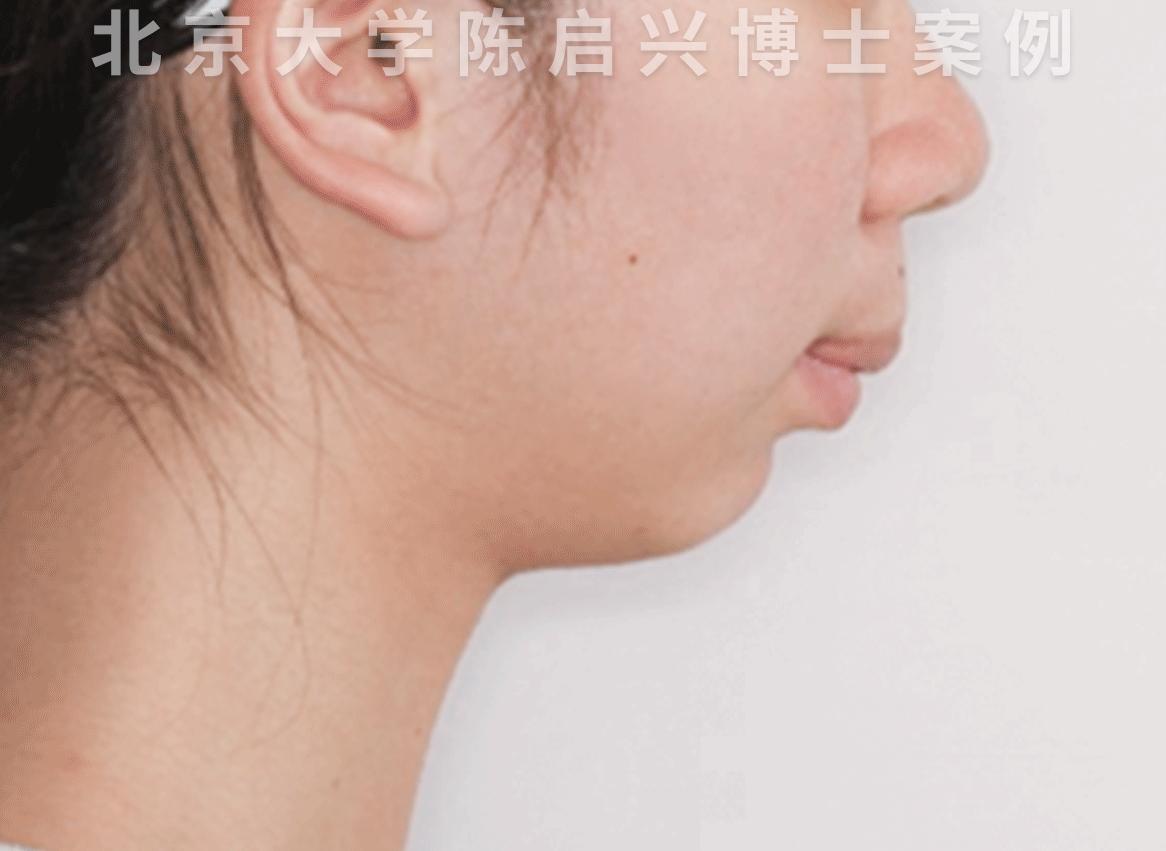 她是属于典型的骨性双颌前突,所以嘴唇看起来很厚,下巴也明显后缩,露龈笑严重,除此之外,她还存在牙齿拥挤不齐的问题。