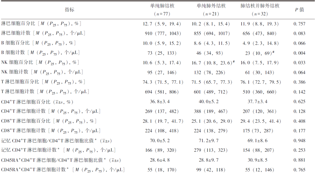 相较于单纯肺结核,单纯肺外结核[4.0(2.5,9.5)个月比2.0(0.9,4.8) 个月, P=0.008]、肺结核并肺外结核[3.5 (1.5,11.0) 个月比2.0(0.9,4.8) 个月, P=0.008]患者病程均延长。相较于单纯肺结核患者,肺结核并肺外结核患者B细胞计数降低,单纯肺外结核患者NK细胞百分比升高(P 均<0.05)。3组外周血淋巴细胞亚群其他指标均无显著差异(P 均>0.05),见表4。