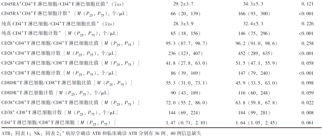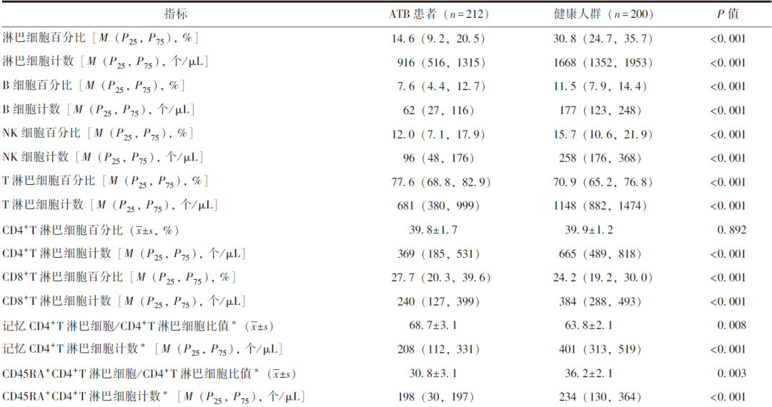 本研究局限性:(1)ATB患者与健康人群的临床资料主要来源于病历记录或体检报告,部分人群的淋巴细胞亚群指标存在缺失。(2)健康体检者仅在年龄、性别构成上与ATB患者进行了匹配,ATB患者可能存在肾衰竭、病毒感染、恶性肿瘤、使用免疫抑制药物等影响淋巴细胞亚群的因素,导致研究结果存在偏倚。(3)未进行多因素分析,难以避免混杂因素的影响。