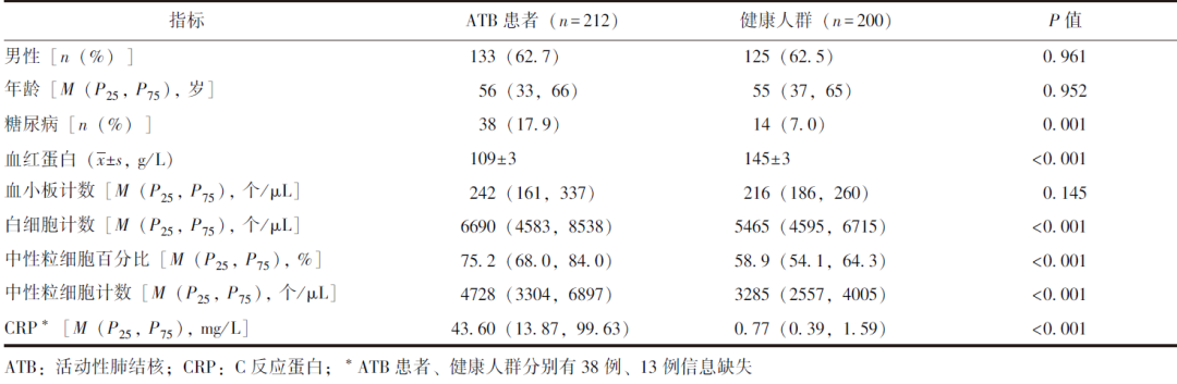 共入选符合纳入与排除标准的ATB患者212例、健康人群200例。ATB患者中,临床确诊82例、病原学确诊130例(包括单纯肺结核77例、单纯肺外结核21例、肺结核并肺外结核32例);合并肾衰竭3例、人类免疫缺陷病毒感染1例、普通变异型免疫缺陷病1例、活动性乙型肝炎1例、肾移植2例、恶性肿瘤10例;使用免疫抑制药物51例;中位病程2(1,6)个月。