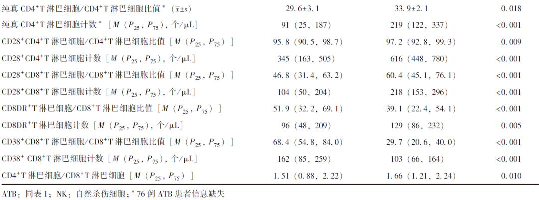相较于健康人群,ATB患者淋巴细胞、B细胞、NK细胞计数及其百分比,T淋巴细胞、CD4+T淋巴细胞、CD8+T淋巴细胞、纯真CD4+T淋巴细胞、记忆CD4+T淋巴细胞、CD28+CD4+T淋巴细胞、CD28+CD8+T淋巴细胞计数等均降低(P均<0.05),T淋巴细胞百分比、CD8+T淋巴细胞百分比、记忆CD4+T淋巴细胞/CD4+T淋巴细胞比值、CD38+CD8+T淋巴细胞/CD8+T淋巴细胞比值等均升高(P 均<0.05),见表2。