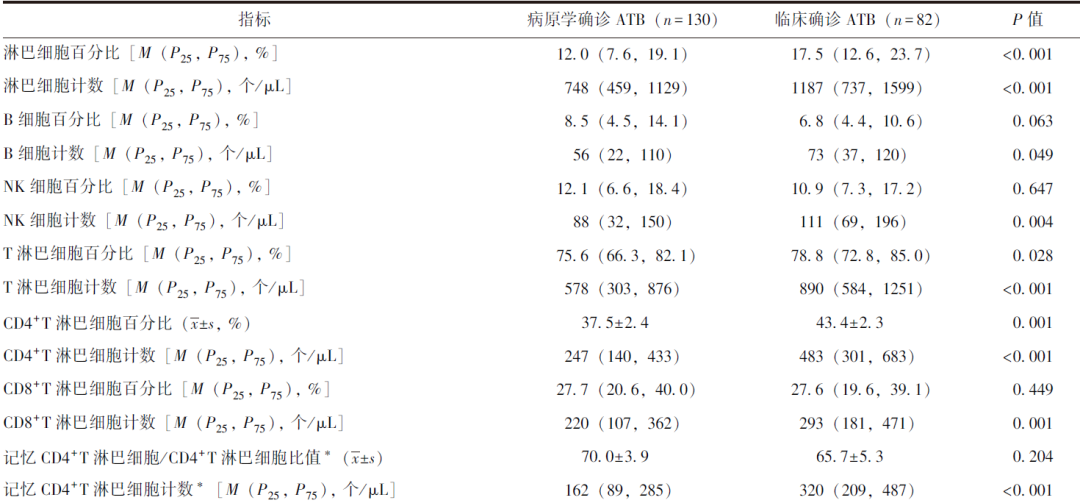 本研究基于北京协和医院长期随访的212例ATB患者,描述性分析了结核病患者外周血淋巴细胞亚群变化特点及其意义,结果显示,相较于健康人群,ATB患者淋巴细胞、B细胞、NK细胞计数及其百分比等多项淋巴细胞亚群指标均降低,而T淋巴细胞百分比、CD8+T淋巴细胞百分比、记忆CD4+T淋巴细胞/CD4+T淋巴细胞比值、CD38+CD8+T淋巴细胞/CD8+T淋巴细胞比值等升高(P均<0.05);在不同确诊方式以及受累部位ATB患者组间比较中,亦发现部分淋巴细胞亚群指标存在差异性表达,为了解结核病发病机制提供了一定理论基础。