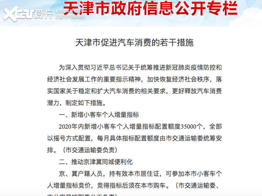 5月21日,天津市人民政府办公厅官方发布《天津市促进汽车消费若干措施》(文中简称《措施》),《措施》中提出2020年天津市将新增小客车个人增量指标配置额度3.5万个,全部以摇号方式配置,每月具体指标配置额度由天津市交通运输委统筹安排。