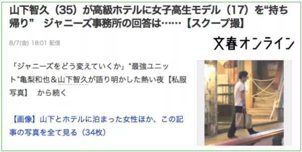 8月7日,日本《周刊文春》报道称,今年35岁的日本杰尼斯事务所男星山下智久,爆出在与其好友龟梨和也一起去酒会派对上喝酒,在酒会上勾搭了17岁女高中生、嫩模爱子,并在之后开了一间10万日元的酒店套房(约合人民币6700元),在房内与嫩模密会8小时。