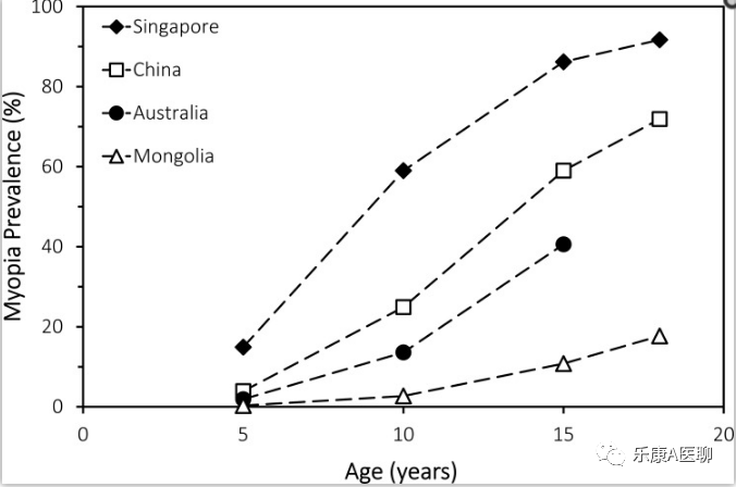图3:从系统回顾和定量荟萃分析调整到 2005 年(蒙古除外,即 2003 年),选定居住国的东亚人按年龄划分的近视患病率模型。根据 Rudnicka 等人的表 4 中的数据创建的图表。37