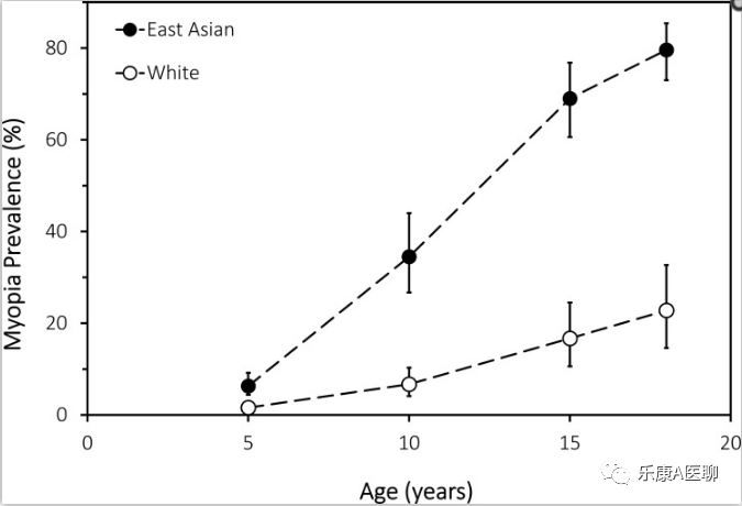 图1:根据 2005 年的系统评价和定量荟萃分析,模拟东亚和白人儿童和青少年的近视患病率。表3Rudnicka 等人的。37