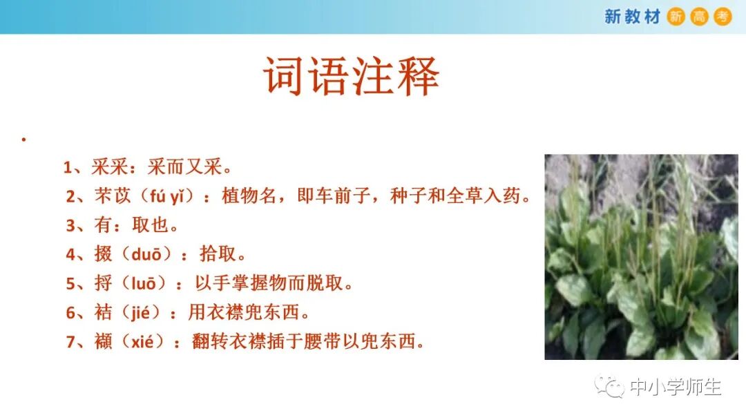 采采:采而又采。芣苢(fúyǐ ):植物名,即车前草,其叶和种子都可以入药,有明显的利尿作用,并且其穗状花序结籽特别多,可能与当时的多子信仰有关。薄言:发语词,无义。这里主要起补充音节的作用。有:取得。掇(duō):拾取,伸长了手去采。捋(luō):顺着茎滑动成把地采取。袺(jié):一手提着衣襟兜着。襭(xié):把衣襟扎在衣带上,再把东西往衣里面塞裹。