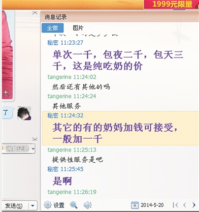 进入房间号,奶妈表示要先付钱。拿到1000元后,她直接掀开上衣准备脱掉,记者赶紧以还没做好心理准备为由,阻止了“喂奶服务”,表示只要聊会天就行了。 没想到奶妈随后问道:“你嫖?价格另算,再加价1500元。”说自己带了女式避孕套。记者以现金不够后拒绝,甚至拿过记者的钱包翻看后发现现金不够才算了。