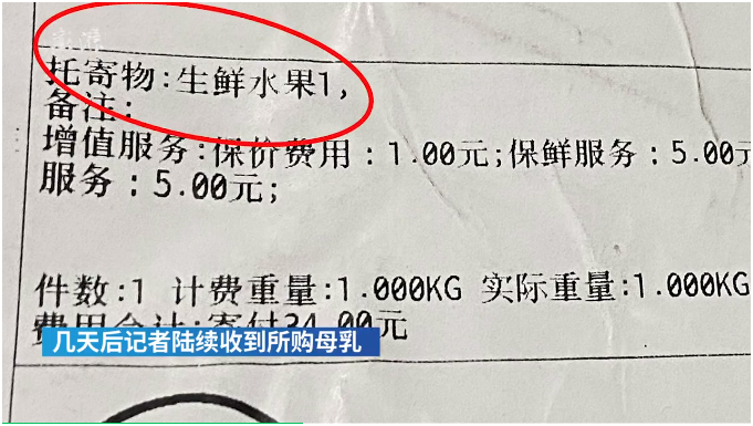 有的卖家称,自己现在除了喂自家孩子外,一天也有800毫升左右多余的母乳。表示自己在孕期哺乳期时也很注意:“整个孕期没有生病,怀孕是也有吃燕窝。小孩生好后钙片没停过。忌辛辣刺激,少盐,不吃味精。”但这位卖家没有提供任何相关体检证明。不仅是她,几乎所有母乳的卖家都没有提供相关体检证明,有些人会晒出保健品和宝宝的照片来证明母乳品质很好。 根据量和日期的不同,该卖家给母乳定价为每袋30-100元不等。一般来说,日期较新,单袋量在200毫升左右,要是初乳,价格可高达100元一袋,反之则价格较低。 在谈好价格后,该名卖家发来一个二手交易平台的商品链接,上面显示为生鲜水果,包装为冷链运输包裹,两天后收到包裹,但箱中的冰袋已经融化成水了。