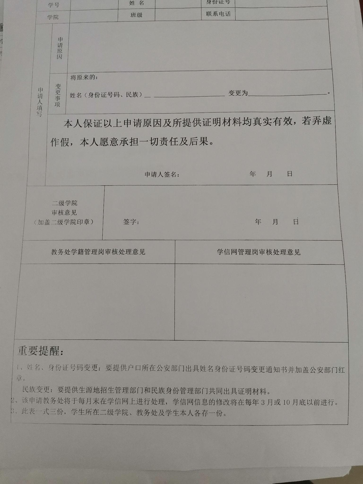 3、签完字盖完章之后拿着表去学校教务处学籍信息办理的老师那里,带上身份证、户口本(新的)原件及复印件;公安部门出具的更名通知并盖章。然后老师就给你改学籍信息和学信网信息。(三份)