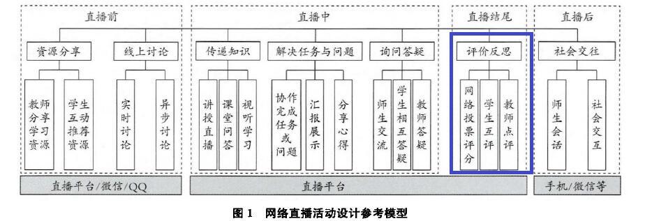 我看这个图啊,这个图讲的是直播的设计流程图。我就看到这个里面直播后就有个评价反思,然后我就有了想法。你看,作者他提到这个反思,这个反思啊,他的基础就是有反馈,要有这个反馈啊,就必然有涉及评价。而且我们结合实际想一想,正常教育的反馈步骤都已经很重要了,何况直播教育呢?因此在现实层面,这个也的的确确是一个重要的方面。