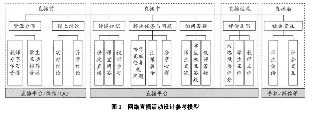 比如《5G时代直播教育:创新在线教育形态》,他侧重介绍直播教育发展史、现在各方面是什么情况,没有什么参考价值;再比如《后疫情时期网络直播教学的理性审思》这篇文章,他讲到学习活动过程设计主要是对学习资源、学习任务、学习过程、学习监管、学习支持以及学习评价环节的设计。[11]也有学者提出了在线学习活动设计的简化四模块,即任务、场景、辅导支持、评价。
