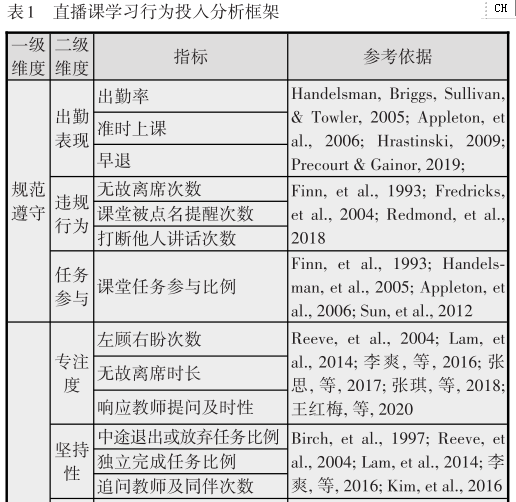 我们来看一下摘要:当前直播教学已经成为在线教学的重要形式,亟须围绕直播课的教学规律和学习特征开展理论与实证研究,以规范和优化直播教学实践,而直播课学习行为投入评估是值得优先关注的问题之一。本研究基于学习投入相关理论与研究成果构建出直播课学习行为投入评价框架,包括规范遵守、学习参与和社会参与三个维度,共24个指标。之后,以ClassIn平台一门少儿英语小班直播课为例,基于课程16课时共计950分钟的教学实录以及日志记录的课程数据对预设指标进行初步验证,采用层次分析法,邀请教育技术领域专家确定各维度及指标权重,最终定义出直播课学习行为投入评估指标体系。最后,研究基于该评估指标体系对案例课程的学习行为投入特征进行分析,并考察了学生个体、课堂教学和环境因素对学习行为投入的影响情况。【关键词】 在线教学;直播课;学习行为投入;学习评价;评价指标;影响因素;层次分析;学习分析